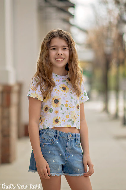 For the second portion of my experiment, I wanted to find a boxy crop tee. This style tee is very on trend now and I had to try it out for my tween! Luckily, Little Lizard King just released Marin and it was exactly what I was hunting. I made a tiny change in the sleeve length though as I knew my daughter would not want the longer short sleeve. I used the sleeve from the colorblocked option and simply left off the bottom colorblocking. She paired these with a new pair of jean shorts she snagged during her birthday shopping spree! This tee was quickly declared the winner of the experiment and I think her pictures reflect how confident it makes her.