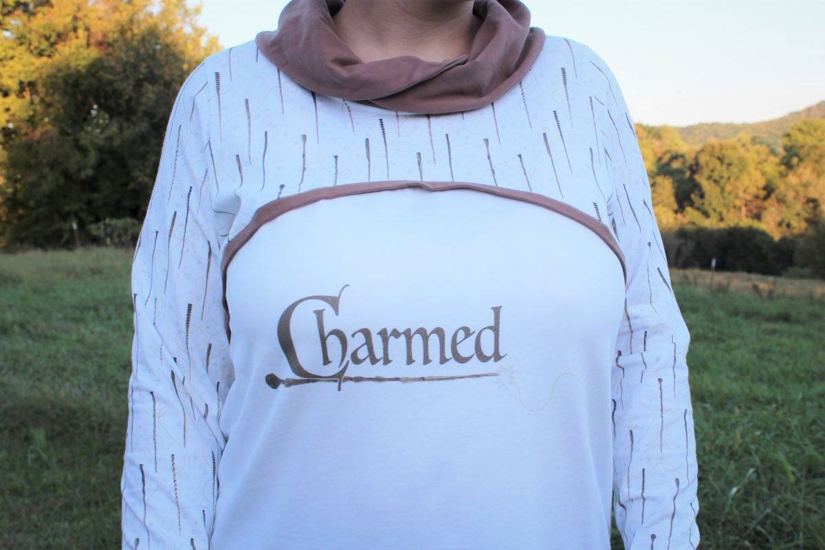 Last year we chose the Brooms panel and Brooms on grey stripes coordinate for our matching Halloween tops. This year’s Fall line had so many great panels and coordinates, it was a really difficult decision. Ultimately, my daughter chose the Charmed Panel with the Magic Wand and Solid Light Milk Chocolate (in the super soft cotton jersey) as coordinates for this year’s top.