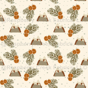 Mountains, pine and oranges with snow on a buttercream backgroud.