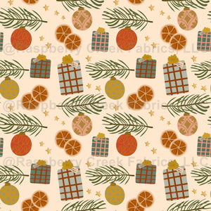 Whimsical arrangement of gifts, orange slices, stars and ornaments on