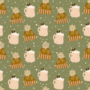 Cocoa mugs and winter hats on Sage green background.