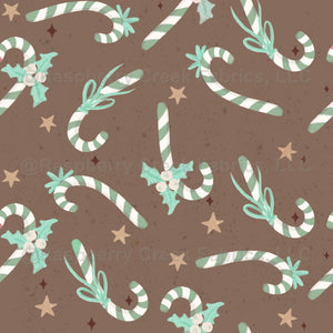 Candy canes, brown, green, mint candy canes, mint green, stars, rustic, holiday, tossed, non directional, Christmas, old fashioned Christmas, coordinate