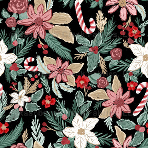 Candy canes, holly, floral, pine, botanical, winter, dark green, pink, girls, women, Christmas, red, green, poinsettias, black