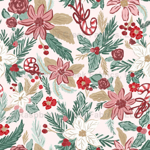 Candy canes, holly, floral, pine, botanical, winter, dark green, pink, girls, women, Christmas, red, green, poinsettias, light pink