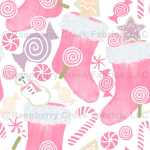 Pink Santa Socks with Christmas cookies and candies on a light yellow background by Club Creative Art, V. Campos-Hallstrom.