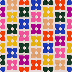 This vibrant geometric pattern showcases a captivating blend of cobalt blue, yellow, purple, dark green, and pink hues. Set against a creamy background, its bold colors and dynamic floral shapes create a visually stunning design that adds a lively touch to any space. Inspired by the sixties and seventies, this pattern brings a nostalgic yet modern vibe to your home decor. Designed by showmemars