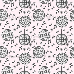 "Disco Balls and Music Notes" is a lively seamless pattern featuring illustrations of shiny disco balls alongside musical notes. This vibrant design captures the energetic and festive atmosphere of disco dance floors, making it a perfect choice for projects that celebrate music, dancing, and a groovy aesthetic.