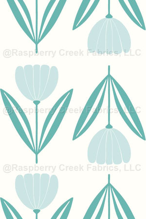 Minimalist tulip-inspired flowers in soft blue and green. This modern botanical design has a Scandinavian and mid-century aesthetic.