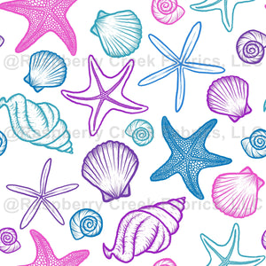A line art design with multicolor starfish and seashells on a white background. Pairs well with designs in my Mermaid Magic collection.