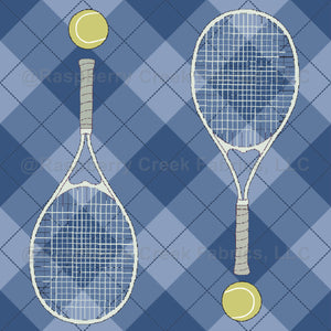 Yellow tennis balls and white rackets on retro blue Argyle plaid background