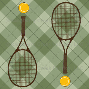 Yellow tennis balls and brown rackets on retro green Argyle plaid background