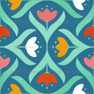 Indulge in the beauty of Pretty Florals in pink, red, yellow, white, and light green leaves, arranged in captivating geometric shapes of tulips. Tulip Geometry On Teal Color presents a vibrant, seamless pattern in a charming geometric style. Whether adorning a cozy country house or a retro-inspired space, this eye-catching design is perfect for making a statement on cushions, curtains, bedding. The addition of a light texture adds an organic and unique touch. With mosaic-like tulips rotated in different directions, it creates a mesmerizing kaleidoscope effect.