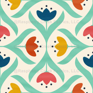 Vibrant florals in red, orange, yellow, dark blue, and light green leaves. Geometric tulip shapes create a striking mosaic.