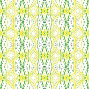 A geometric pattern featuring interwoven green and yellow lines forming symmetrical diamond shapes. The abstract design is seamless, with vibrant colors on a white background, suitable for modern wallpaper or textile design.
