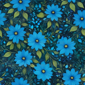A lush and captivating floral pattern featuring vibrant blue flowers with yellow centers, set against a rich dark green background. The design showcases large, detailed blooms interspersed with green leaves and smaller blue floral elements, creating a dynamic and eye-catching composition. This seamless pattern would be ideal for fabric designs, wallpapers, or digital art projects, offering a bold and refreshing take on botanical themes.