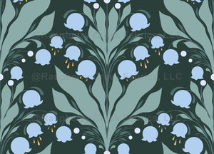 Art Nouveau pattern with blue flowers bells. Texture with blue floral symmetrical arrangement on a dark green background.