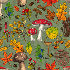 Autumn mushrooms, leaves, nuts and berries on green