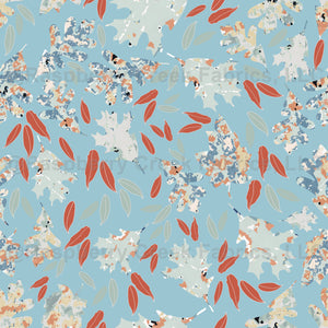 From my Autumn Retreat Collection of Patterns, "Falling Leaves" on light blue ground. Design by Jenn Steffen.