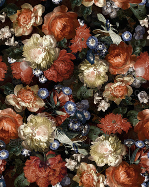 A luxurious enchanting masterpiece of floral picturesque design with beautiful antique dark shiny vintage flowers painted by