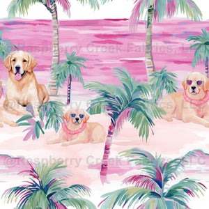 The ultimate beach getaway with a tropical print featuringgolden retrievers donning stylish sunglasses, basking in the sun-kissed shores.