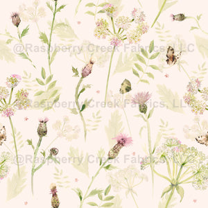 Beautiful summer hand painted watercolour artwork of Scottish thistles and butterflies, calming and relaxing in soft pinks and greens.