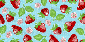Strawberries and Blossoms on Lt. Aqua Blue Wallpaper - Hand Painted Strawberry Fruit Floral