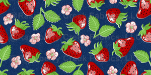 Strawberries and Blossoms on Navy Blue Fabric - Hand Painted Strawberry Fruit Floral