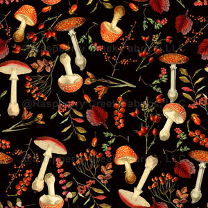 Antique hand painted mushroom pattern with different forest mushrooms, branches, blossoms, wild flowers, design by Uta Naumann UtART from Germany An exceptionally luxurious design with beautiful details - a solitaire for your home.