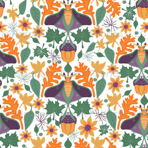 Non-traditional colored Luna moth with Autumn motifs surrounding them. Fall items include leaves, sunflowers, and acorns.Design by Club Creative Art, Veronica Campos-Hallstrom.