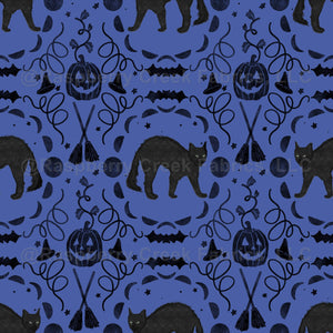 Blue, black, watercolor, jack-o’-lantern, Halloween, black cats, moon phase, fall, witch hat, bats, brooms