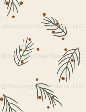 Part of Boho Christmas collection. Simple pine branches with berry accents. Muted green and red colors on a neutral beige background,