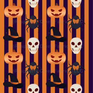 Halloween theme with skull, spider, witch's hat, and pumpkin on top of the stripes pattern