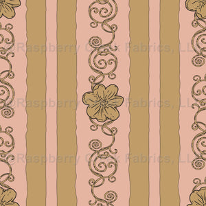 Black outlined Camel Yellow stripes, scrolls, and florals on a solid Peach background, coordinate of the "Free Spirited Lilith's Trailing Florals Collection".