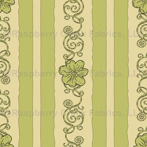 Black outlined Dark Khaki Green stripes, scrolls, and florals on a solid Cream background, coordinate of the "Free Spirited Lilith's Trailing Florals Collection".