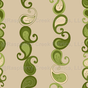 Medium sized simple paisley motifs arranged into vertical stripes, in shades of green, cream, and beige on a light background.