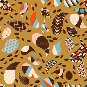 Retro Patchwork Paisley Mustard – Mid Century Modern mixes groovy paisley swirls and mid-century geometry in a bold mustard palette. The patchwork layout brings structure, while the florals and curved motifs add playful movement — perfect for sewing retro statement pieces with warmth and charm.