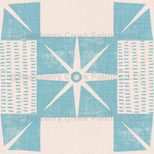 Retro Starburst Quilt Block – Minimalist Mid Century Blue features bold starburst motifs arranged in a clean, geometric block layout. Inspired by classic mid-century modern design, this fabric pairs a soft blue palette with retro atomic shapes, perfect for adding vintage flair to your sewing projects.