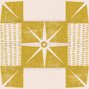 Retro Starburst Quilt Block – Minimalist Mid Century Mustard Yellow features bold atomic star motifs set in a structured quilt block layout with a warm, vintage mustard tone. The distressed texture adds a hand-printed, mid-century feel — perfect for sewing retro-inspired home decor, apparel, or quilting projects. Use it to create striking pillows, nostalgic kidswear, or classic mod quilts. A true statement fabric for lovers of 50s design and warm, earthy tones.