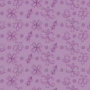 Imaginary Bugs, Ants, and Butterflies in Dark Purple Line Art on Purple Arranged Somewhat Vertical Stripes