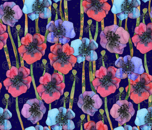 Multicolored anemone flowers and seeds on blue background. Watercolor hand painted