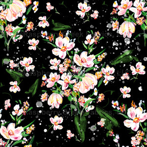 Pink and white wildflowers gathered in a bouquet, green leaves and stems, scattered flowers and paint splatter on a black background. Directional layout. From an original Acrylic painting