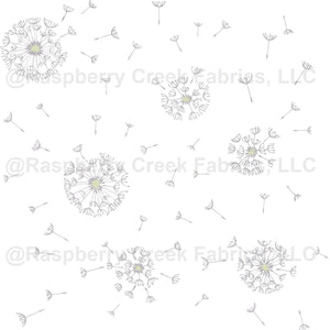 Wispy dandelions float across a clean white background, reminiscent of blowing dandelions on a spring day.