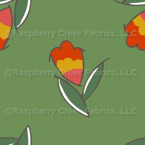 Part of the golden florals collection, fun daisies in red gold and salmon on a warm green background.
