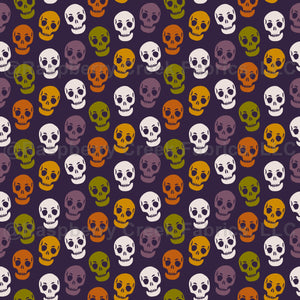 Halloween scary skulls in yellow, orange, green, violet, white on dark blue background