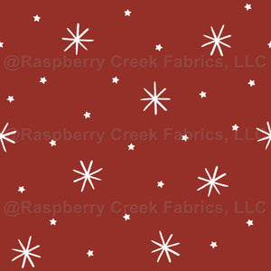Warm red filled with hand-drawn white stars and snowflakes for a cheerful holiday print. A classic Christmas coordinate to match with the Happy Camper Christmas set. Perfect for cozy quilts and festive sewing.