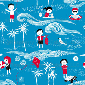 Cute children having fun on the beach. Pops of crimson red on a medium blue background with white detailing. Designed with a hand drawn retro feel.