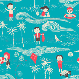 Cute children having fun on the beach. Pops of medium pink on a dark turquoise with light tan detailing. Designed with a hand drawn retro feel.