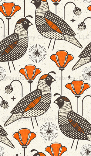 My original vector illustrations of quail in a field of poppies and dandelions, in brown, orange, and shades of tan, with simulated texture throughout the design. ©Christine Duffield 2023