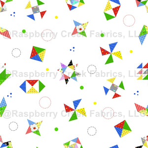 Quilt Block Toss on White - HST Addict Collection - Half Square Triangles, Stars, Baskets, Pinwheels - Tomato Red Royal Blue Grass Green Sunshine Yellow