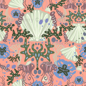 Under the waves, you'll find sea weed and shells. The repeating pattern contains coastal elements that hug the nautical theme with a peach background color. This is designed by artist Veronica Campos-Hallstrom, Club Creative Art as a non-directional repeating pattern. It also is available with a dark midnight blue background.